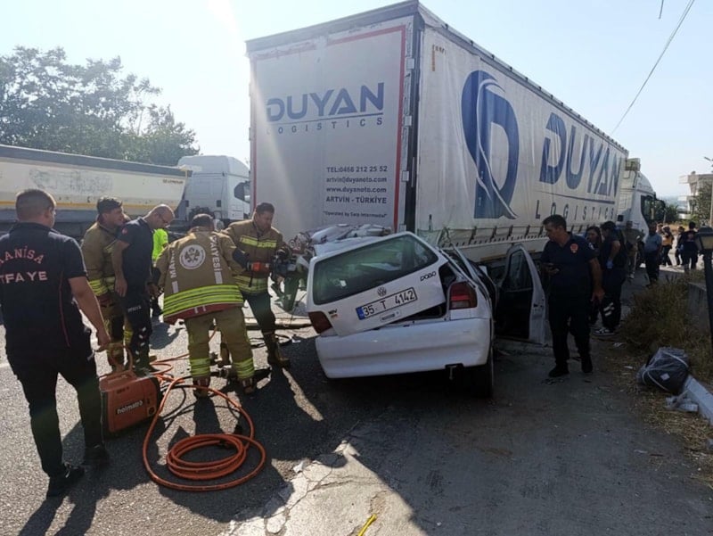 Manisa'nın Turgutlu ilçesi İzmir-Ankara kara yolu Maden Yolu kavşağı yakınlarında Enes Karanfil (18) yönetimindeki otomobil, aynı yöne seyreden Orhan Erol (45) idaresindeki tıra arkadan çarparak demir yığınına döndü.