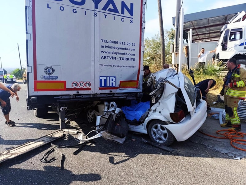 Sağlık ekiplerinin yaptığı kontrolde dorsenin altına giren otomobilin sürücüsü Enes Karanfil ile kuzeni Emre Karanfil'in (14) öldüğünü belirledi.