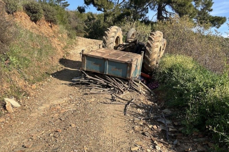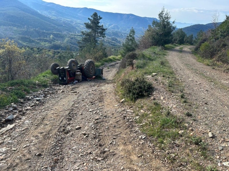 Bahçeden eve dönmek üzere ailesiyle yola çıkan Mehmet Gökçen’in kontrolünü yitirdiği traktör, eğimli arazide devrildi.