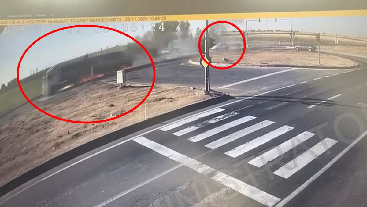 Görüntülerde; hızla gelen tırlardan birinin kavşakta diğer tır ile cipe çarptığı, çarpışmanın ardından tırlardan birinin alev aldığı görüldü.