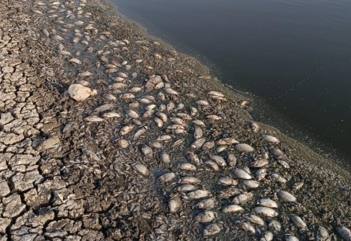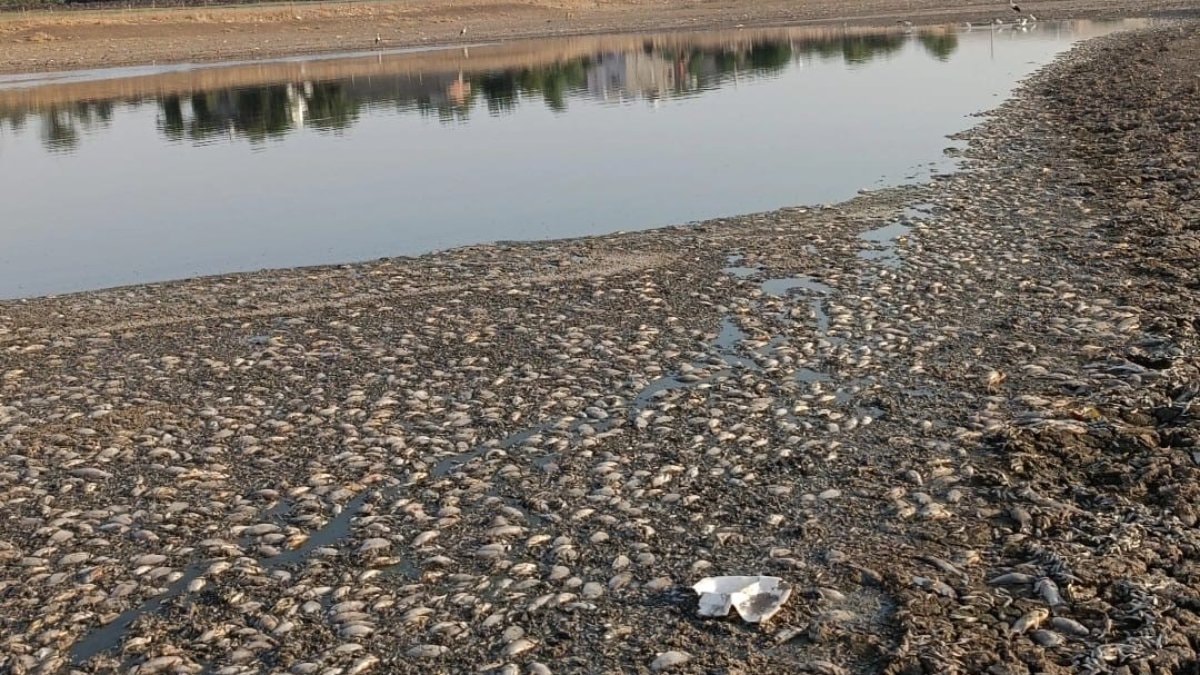 Suyu çekilen gölette bulunan binlerce balık telef oldu.