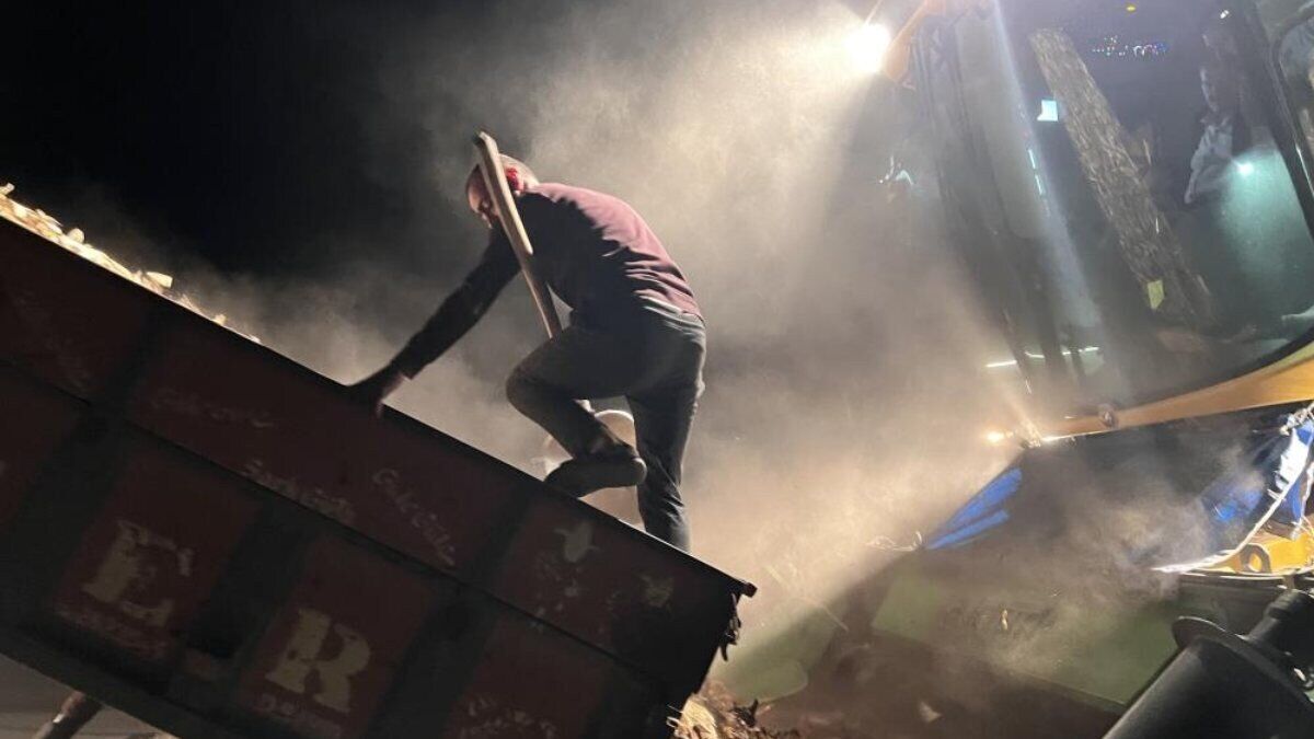 Biçerdövere atmak için havaya kaldırılan römork içinde bulunan mısırlar, biçerdöverin içine düşmedi. Bunun üzerine mısırların sahibi, eline bir kürek aldı ve havaya kaldırdıkları römorkun üzerine çıktı.