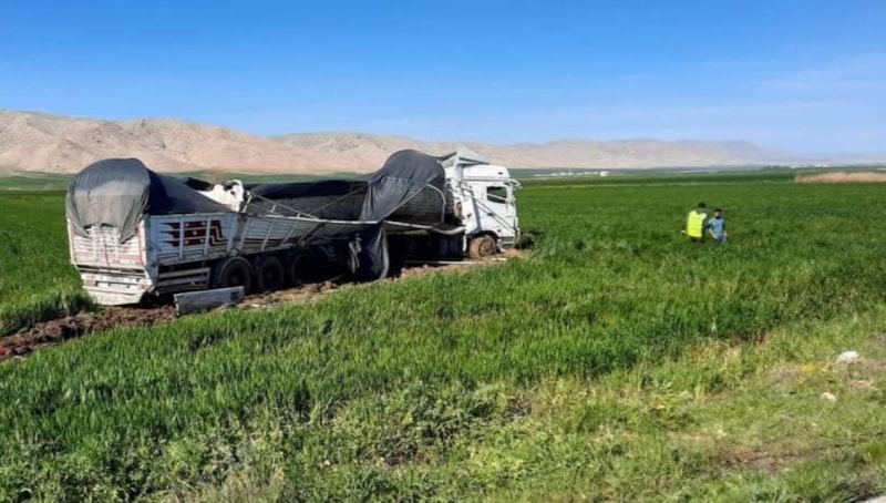 Mardin'de büyükbaş taşıyan tır kontrolden çıkarak devrildi. Sürücünün yaralandığı kazada tırdan inen hayvanlar kara yolunda dolaştı.