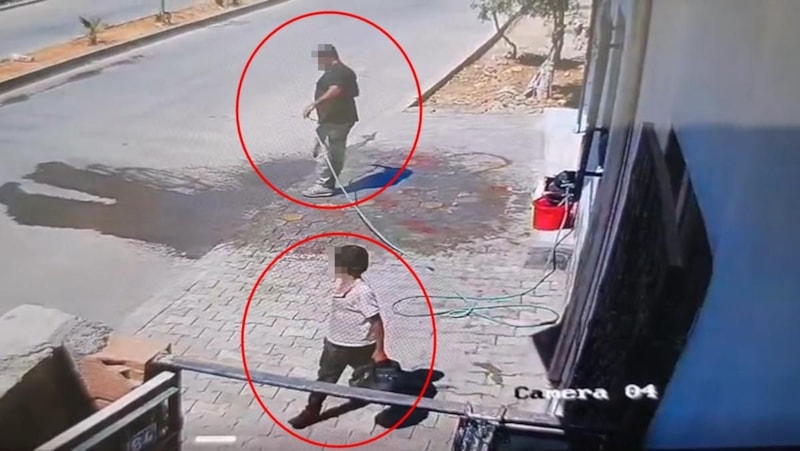 Mardin'in Kızıltepe ilçesinde şarküteri ürünleri satan bir dükkanın önüne gelen baba, küçük yaştaki oğluyla birlikte elini ve yüzünü yıkama bahanesiyle iş yerinin önündeki musluğa bağlı hortumdan suyu kullanmak istedi.