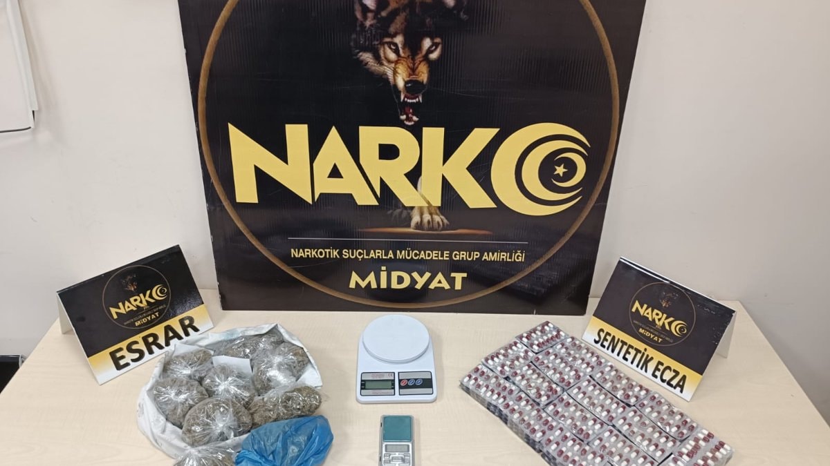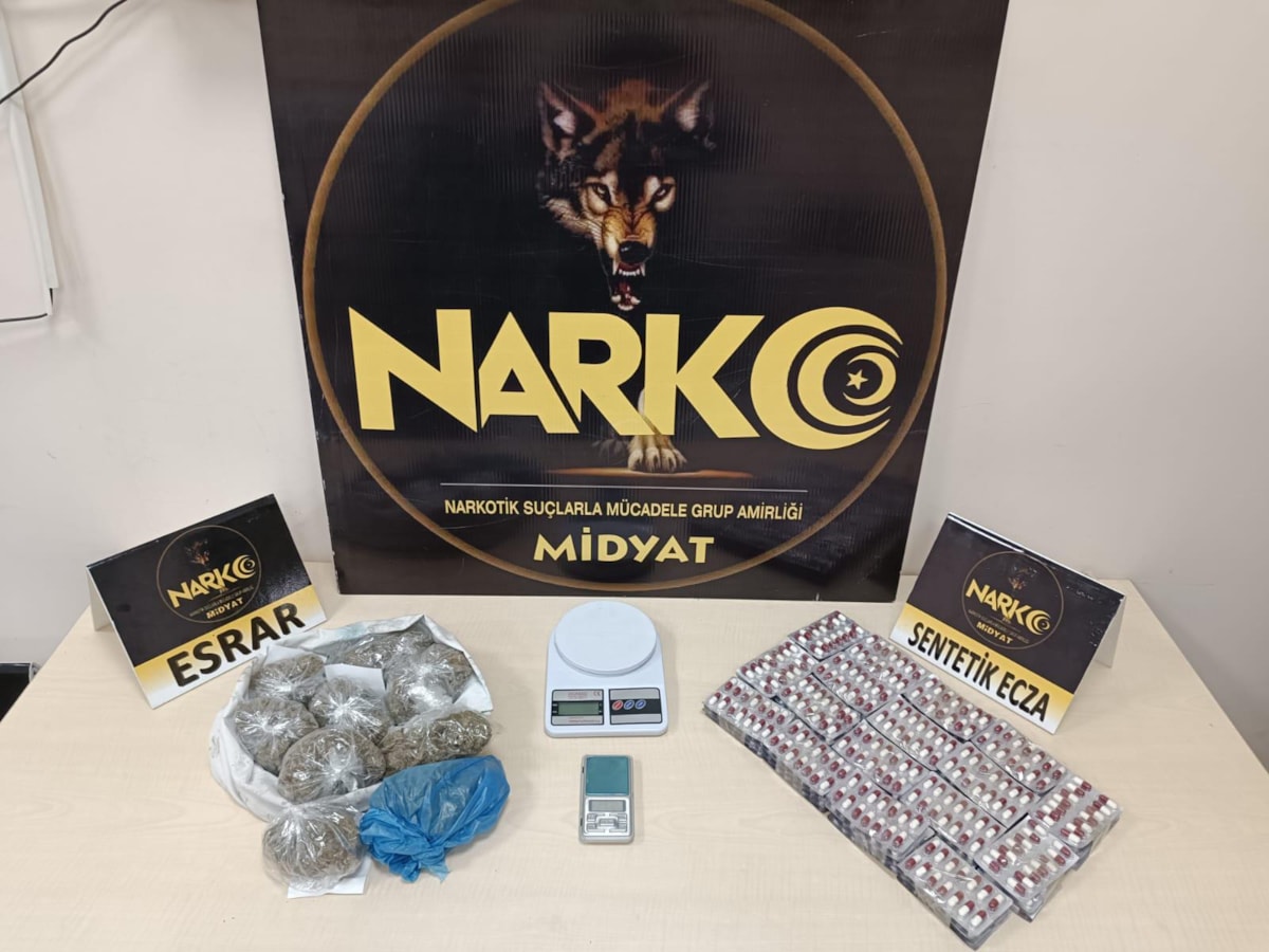 Midyat Cumhuriyet Başsavcılığının talimatları çerçevesinde, uyuşturucu madde ticareti yapan şüphelilere yönelik yapılan çalışmalarda bir adreste yapılan operasyonda, 952 adet uyuşturucu hap, 10 poşet halinde 482 gram esrar maddesi ve uyuşturucu madde ticaretinde kullanılan 2 adet hassas terazi ele geçirildi.