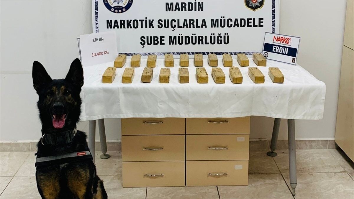 Detektör köpeğin katılımıyla araçta yapılan aramada paketler halinde yedek lastiğin içine gizlenmiş, 10 kilo 400 gram eroin bulundu.