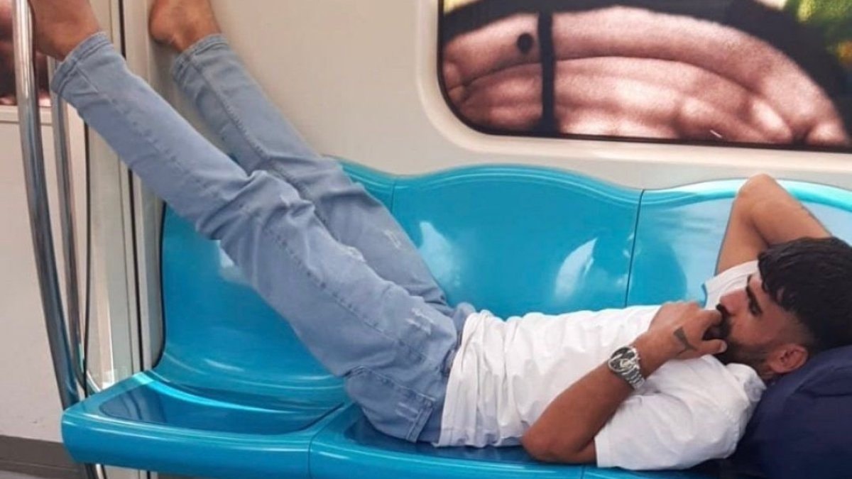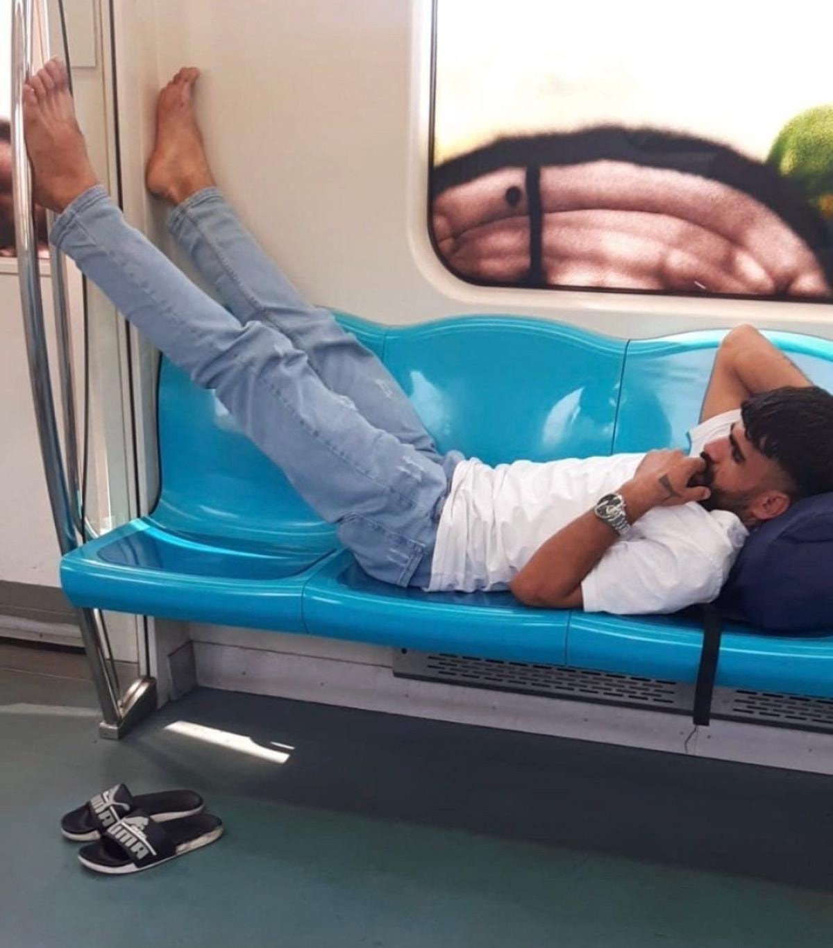 Çıplak ayaklarını da vagon kolonuna dayayan şahıs, diğer yolcuların şaşkın bakışlarına aldırmadan yolcuğa devam etti.