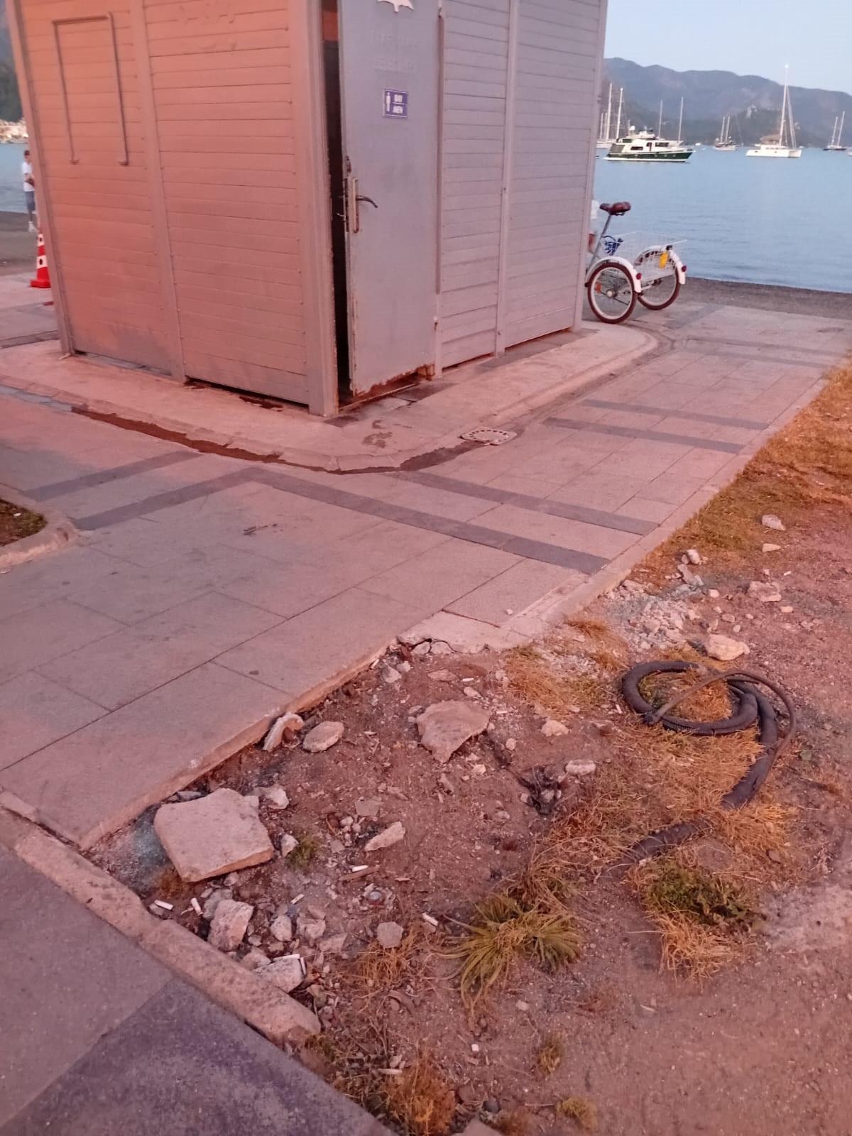 Mavi bayraklı halk plajındaki tuvaletin, pis olmasının yanı sıra çevresinin de bakımsızlığı ve ortada bırakılan ışıklandırma kabloları da vatandaşların kameralarına yansırken, Marmaris Belediyesi'nin ilgisizliği ise adeta yerli ve yabancı turistleri ilçeden kaçırmaya başladı.