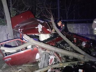 Milli Savunma Üniversitesi'nin duvarına çarpan ve ağacı parçalayarak durabilen otomobil hurdaya döndü. Feci kazada otomobilde 3 kişi yaralandı.