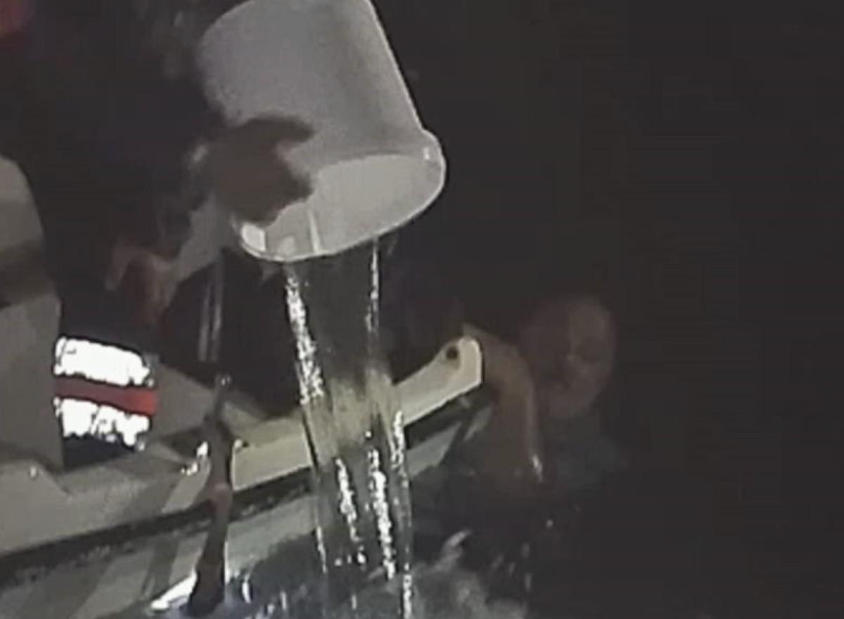 - Teknede su alıp batmaya başlayan fiber tekne halatla yüzeye çıkarıldı ve kova yardımıyla suyu boşaltıldı.
