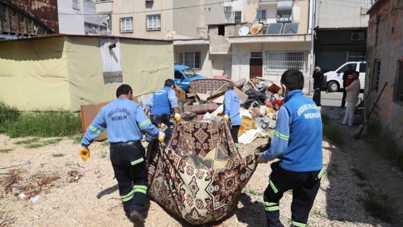 Akdeniz ilçesinde, sahiplerinin hayatını kaybettiği öğrenilen bir evden belediye ekipleri tarafından kamyon dolusu çöp çıkarıldı.