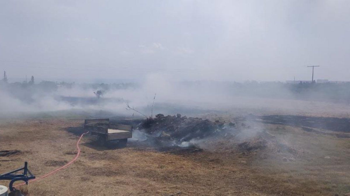 Kuru otlarla birlikte hızla ilerleyen alevler içinden geçtiği bahçede ve tarladaki ağaçlara, sulama boruları ve eski model bir pikaba zarar verdi.