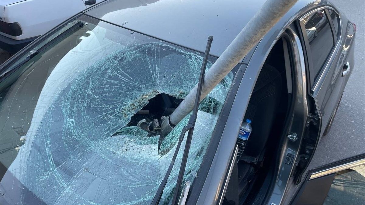 Bu sırada direğin uç kısmı arabanın ön camını kırarak direksiyona saplandı.