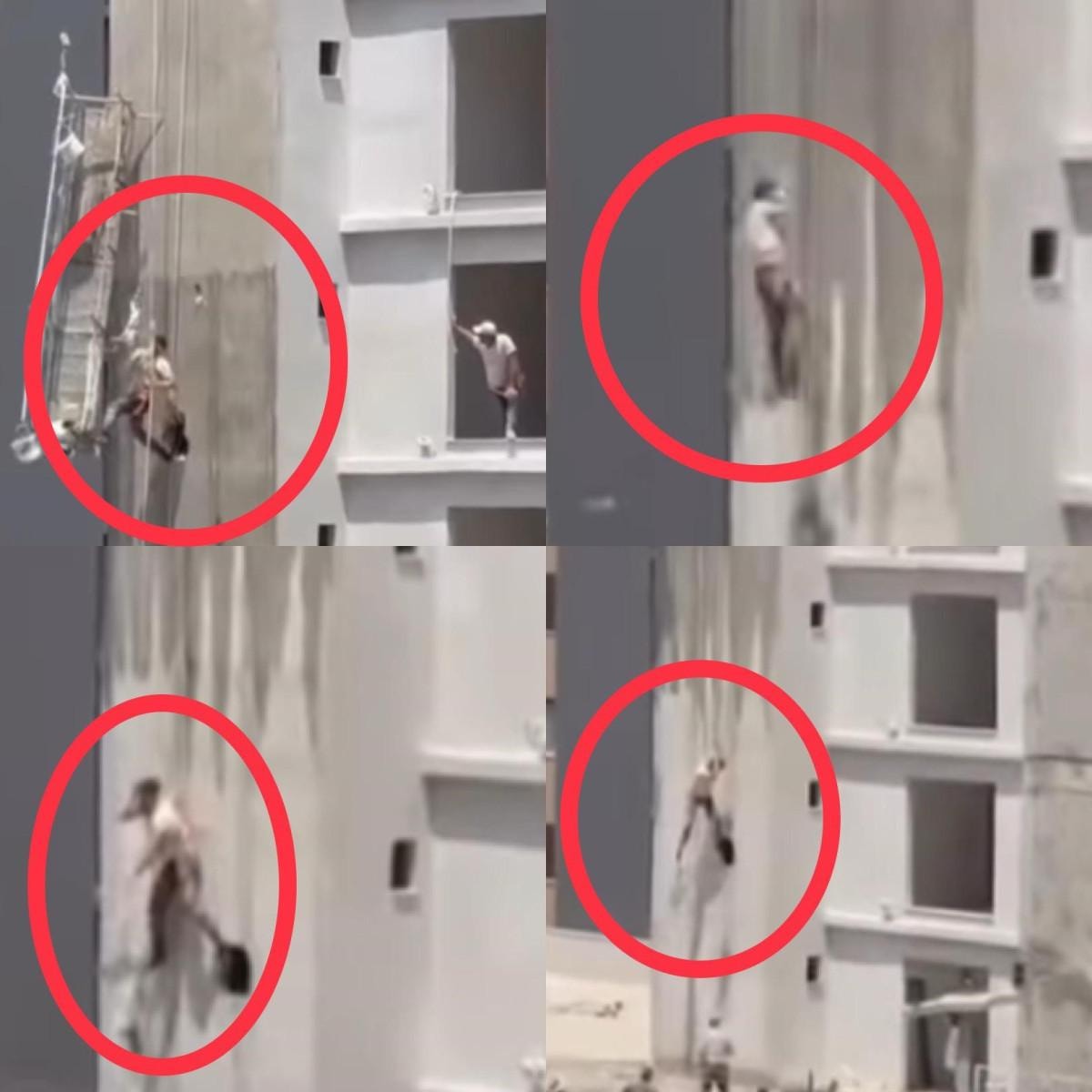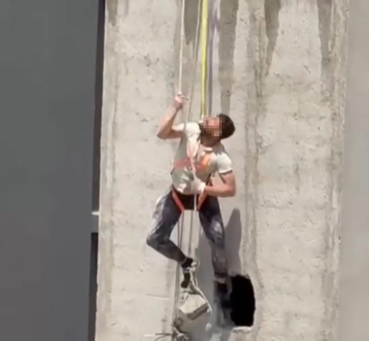 Bir süre sonra emniyet halatının ani bir gevşemesiyle işçi, hızla aşağıya doğru kaydı ancak 1. kat seviyesinde tekrar durdurdu.
