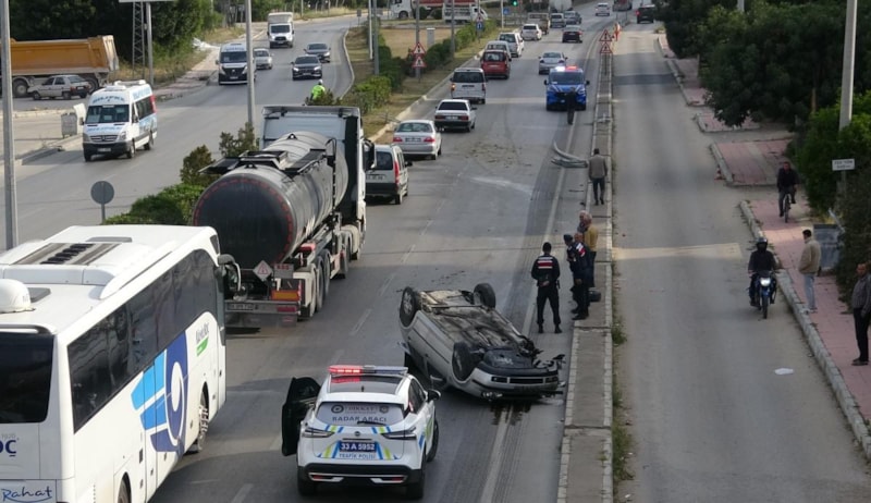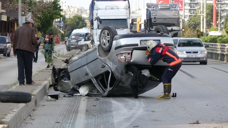 Mersin'de otomobilin ters döndüğü kazada araçta bulunan biri kadın 2 kişi savrularak yaralanırken, el ele sağlık ekiplerini bekledi.