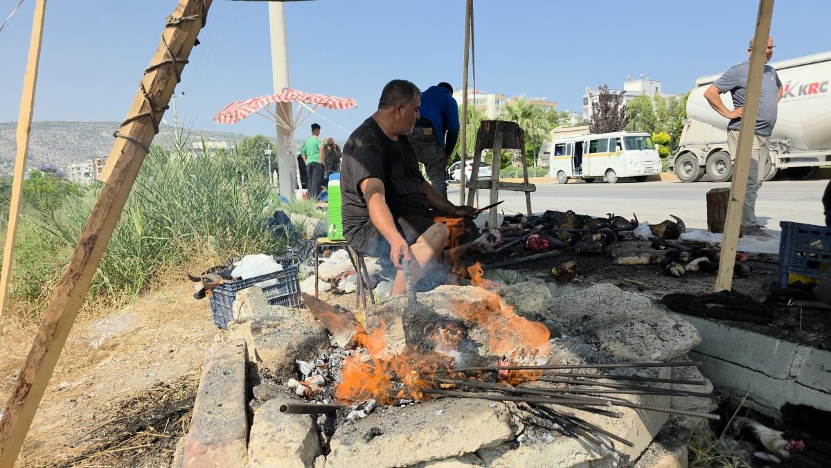 Silifke ilçesinde özellikle demirci ustaları, bayram sabahı kurbanlıklardan çıkan kelleleri ateşle üterek vatandaşa hizmet veriyor.
