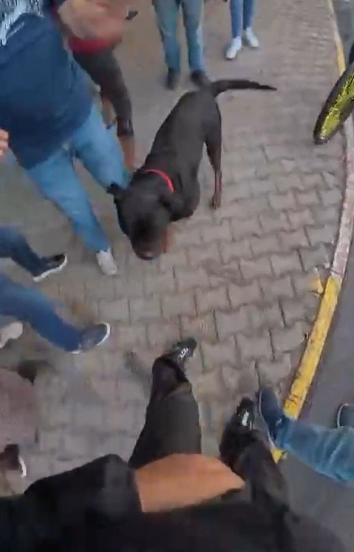 Yere düşen kurye köpeğin dişlerinden acı içinde kurtulmaya çalışırken, çevredekiler hayvanı uzaklaştırmak için yoğun çaba harcadı.