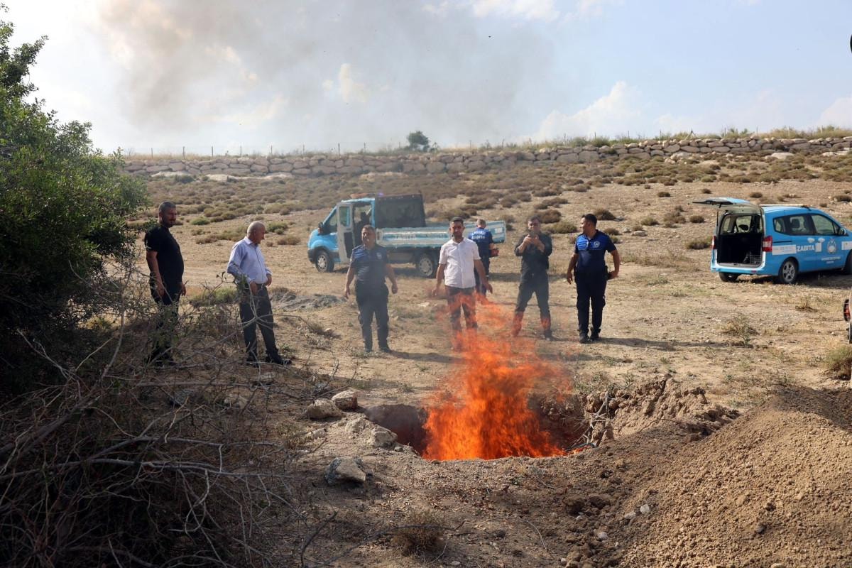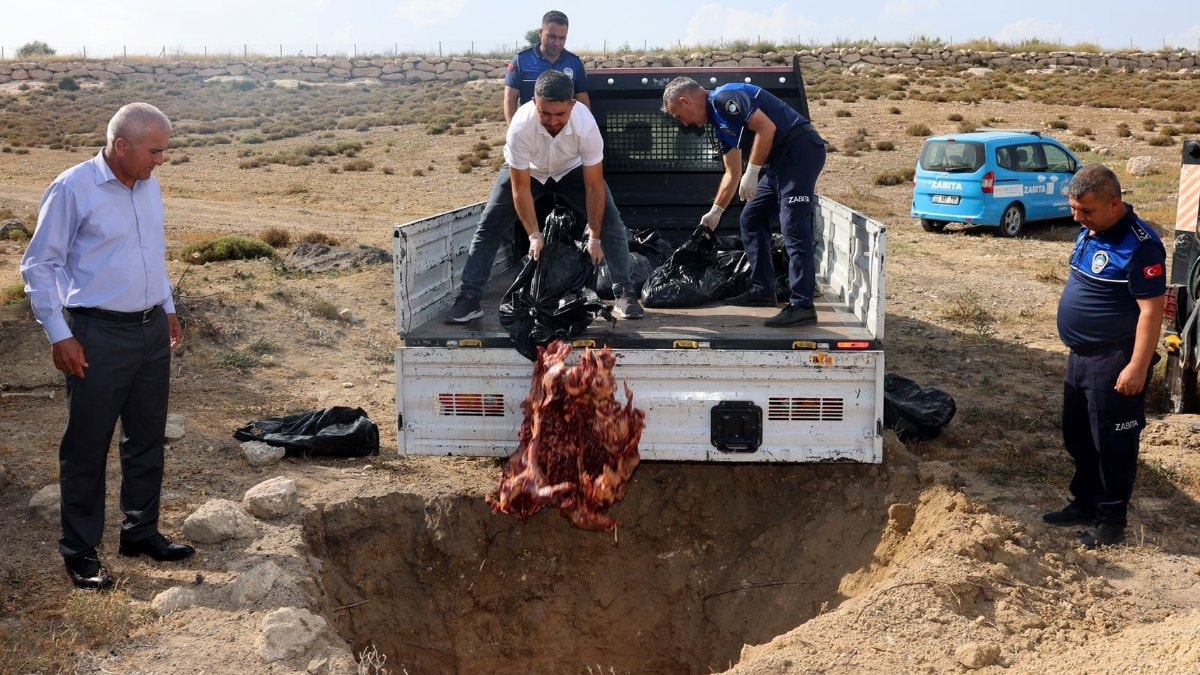 Akdeniz Belediyesi zabıta ekipleri, kent merkezinden uzak kırsal bir bölgede açtıkları derin bir çukura attıkları kilolarca eti yakarak imha etti, ardından üzerini toprakla örttü.