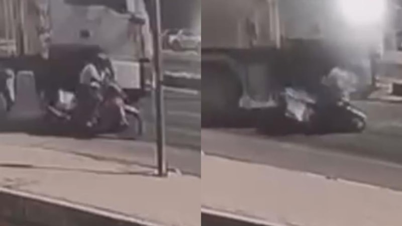 Mersin'de kamyonunun altında kalan motosiklet sürücüsünün yaralandığı anlar güvenlik kamerasına yansıdı.
