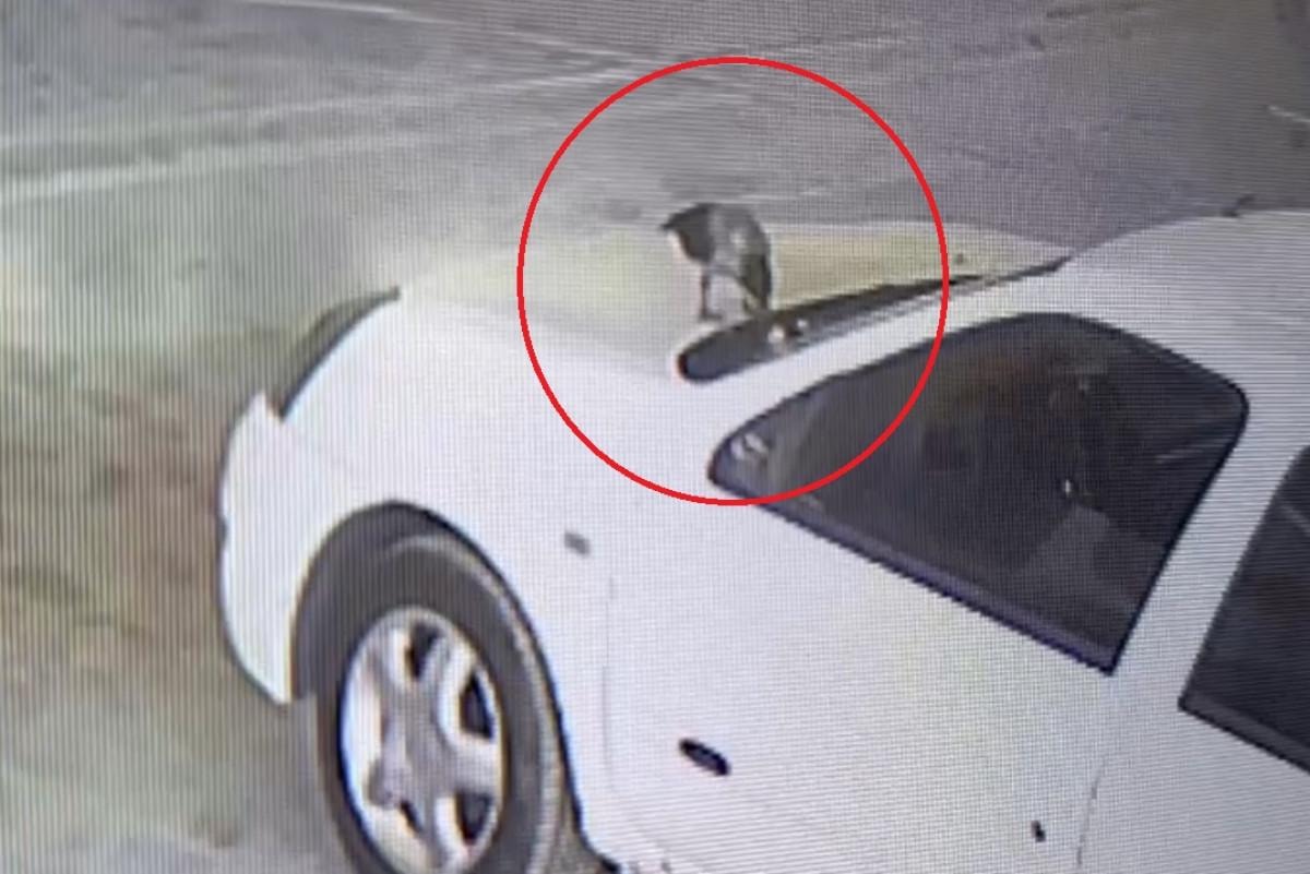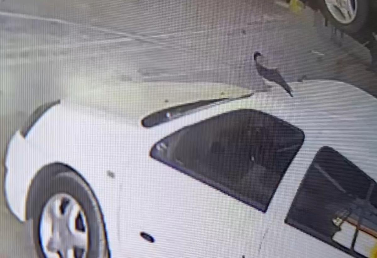 Otomobilin tavanında gezinen kargo, kaput üzerine bırakılan anahtara doğru yöneldi ve gagasıyla alıp uçtu.