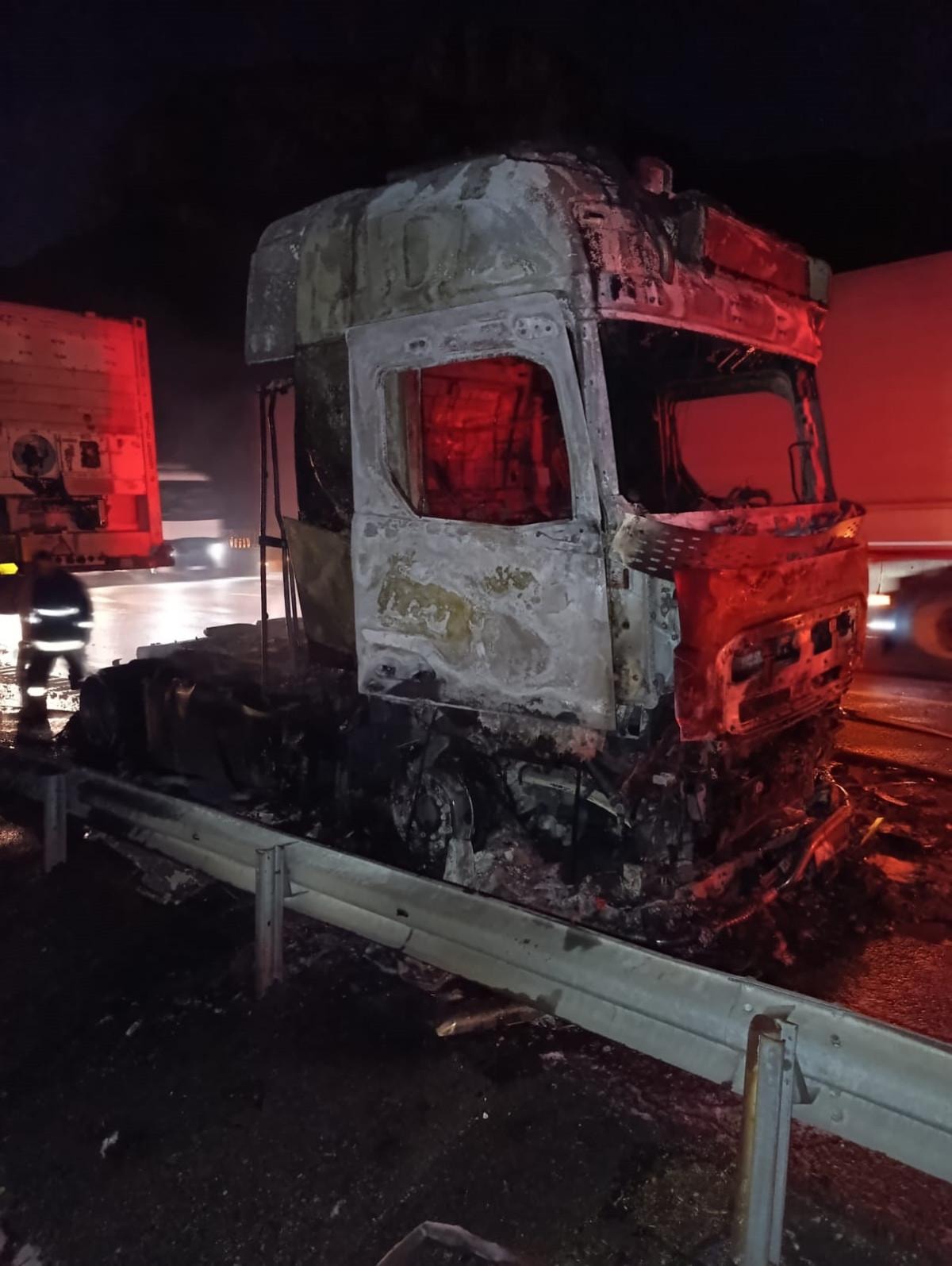 Durumu fark edip tırı emniyet şeridinde durduran şoför, aracı terk etti.