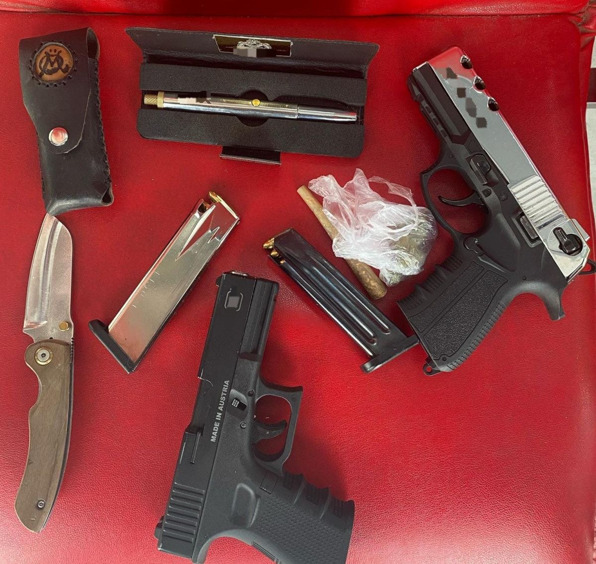 Araç içerisinde yapılan aramada 1 adet kalem tabanca, 2 adet ruhsatsız tabanca ile bir miktar esrar ele geçirildi.