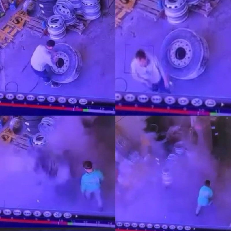 Yaşanan korku dolu anlar iş yerinin güvenlik kamerasına da yansıdı. Görüntülerde, tamir işlemi sırasında çalışan ustanın arkasını dönmesinden hemen sonra lastiğin büyük bir patlamayla yerinden fırladığı anlar yer aldı.