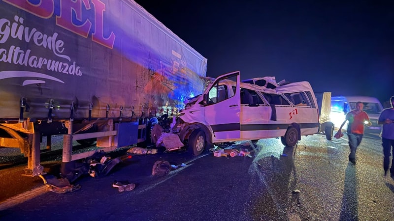 Mersin'in Tarsus-Pozantı Otoyolu Damlama mevkisinde tarım işçilerini taşıyan minibüs, otoyolda önünde giden tıra arkadan çarptı.