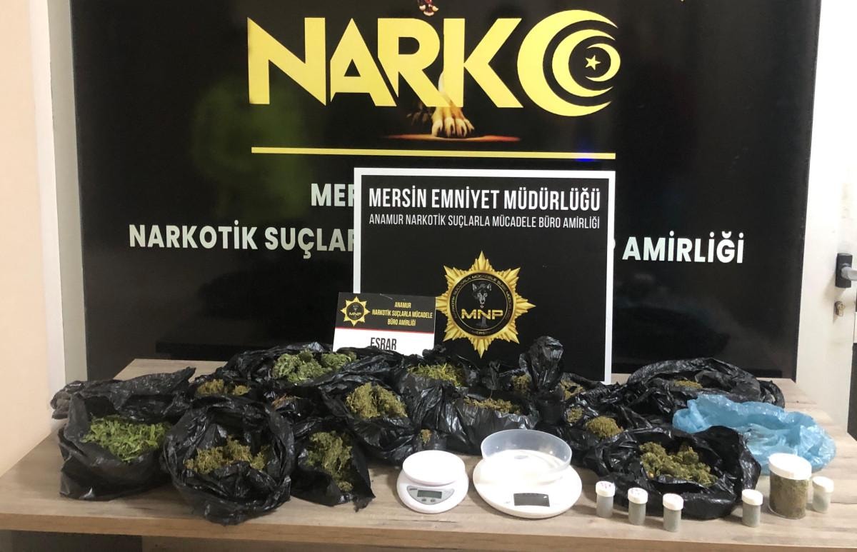 Mersin'de Anamur İlçe Emniyet Müdürlüğü Narkotik Suçlarla Mücadele Büro Amirliği ekiplerince savcılık koordinesinde uyuşturucu ticareti yaptığı belirlenen M.G.'nin adresine operasyon düzenlendi.