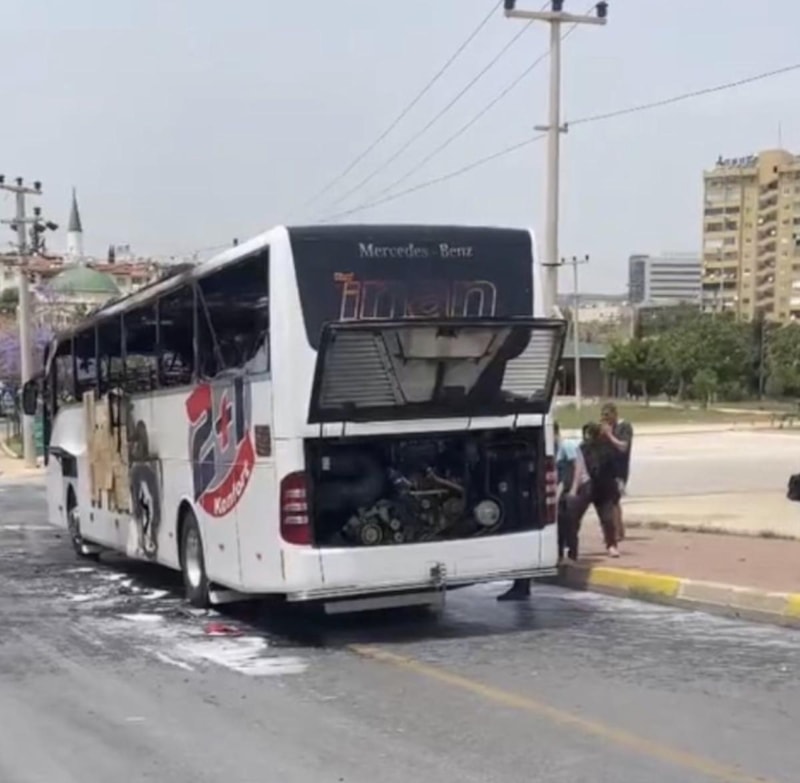 Mersin'de seyir halindeki bir yolcu otobüsü, henüz bilinmeyen bir nedenle alev alırken otobüsten yolcular son anda tahliye edildi.