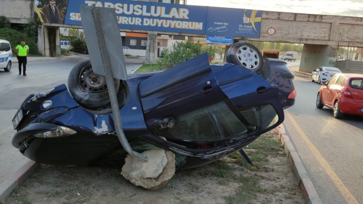 Çarpışmanın etkisiyle kontrolden çıkan 01 EE 221 plakalı otomobil, refüj taşlarına çarparak takla attı. Yoldaki tabela, aracın ön camını patlattı.