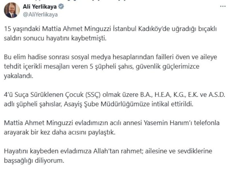 15 yaşındaki Mattia Ahmet Minguzzi İstanbul Kadıköy’de uğradığı bıçaklı saldırı sonucu hayatını kaybetmişti.