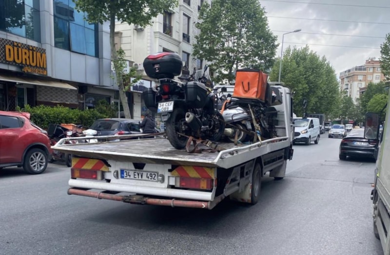 Kask takmadığı gerekçesiyle motosikleti çekici tarafından yediemin otoparkına götürülen sürücü, çekici aracında birden fazla motosikletin yan yana ve sürtünerek götürüldüğünü, buna rağmen otomobillerle aynı ücretin alındığını belirterek isyan etti.