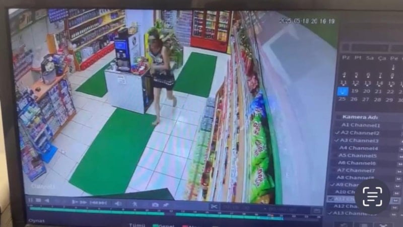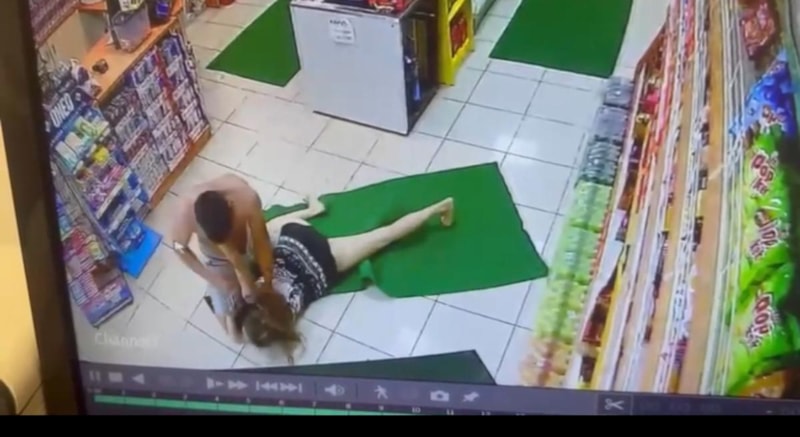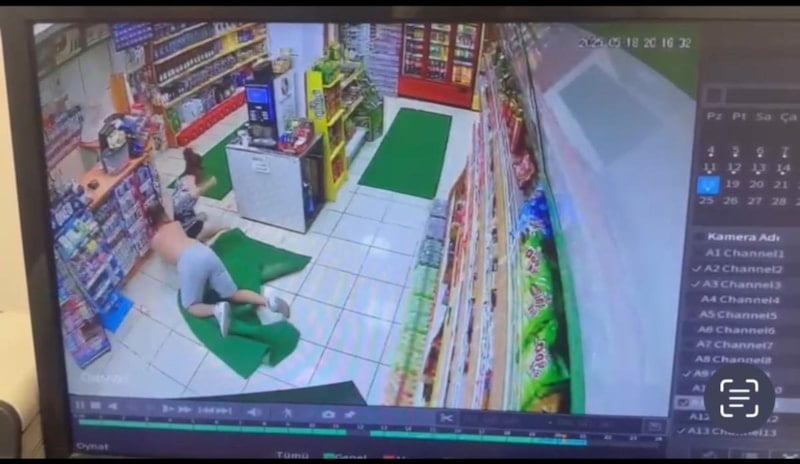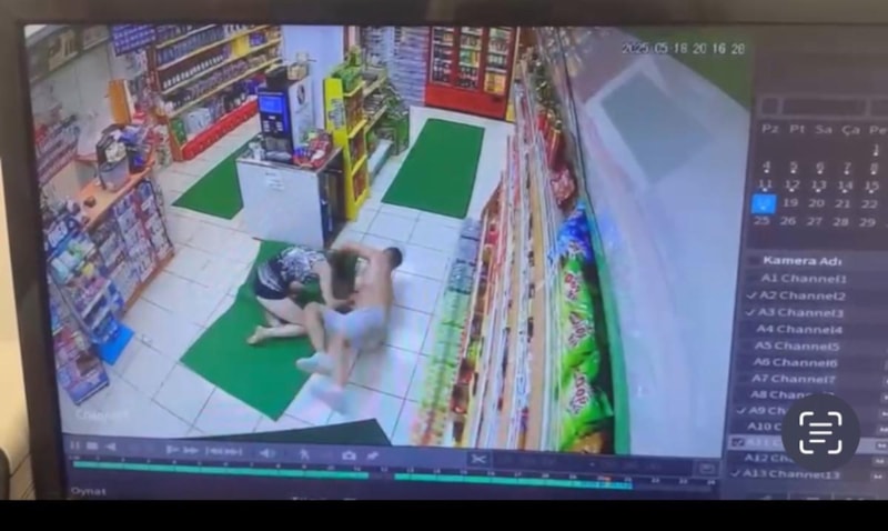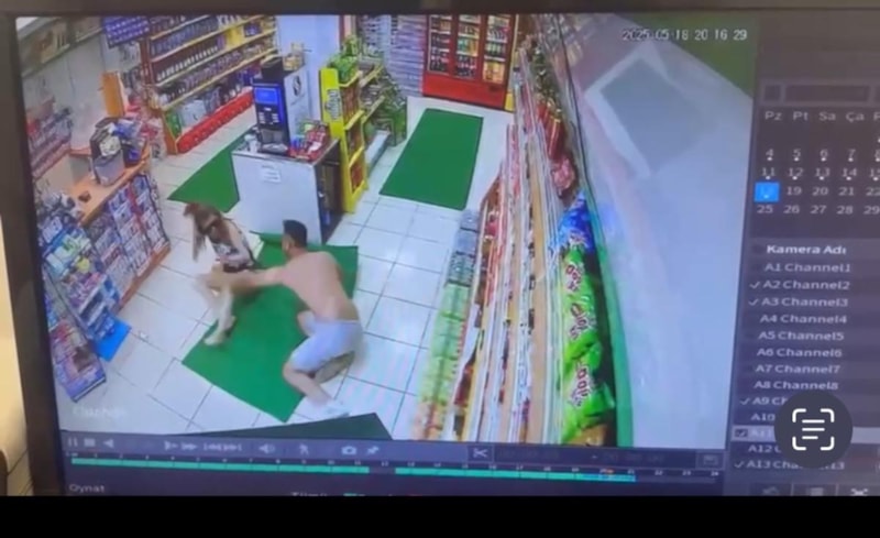 P.D. akaryakıt istasyonunda bulunan markete girerek korunmaya çalıştığı sırada, ardından gelen kişi, P.D.'ye burada da şiddet uyguluyor.