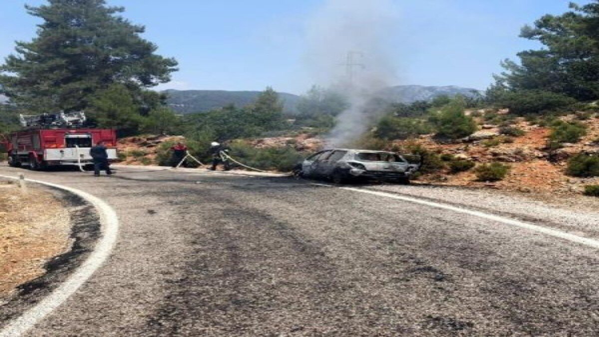 Yanan otomobilde patlama sesleri gelirken, Muğla Büyükşehir Belediyesi Milas İtfaiye Grup Amirliği'ne bağlı ekiplerin müdahalesi sonrası alevler ormanlık alana sıçramadan söndürüldü.