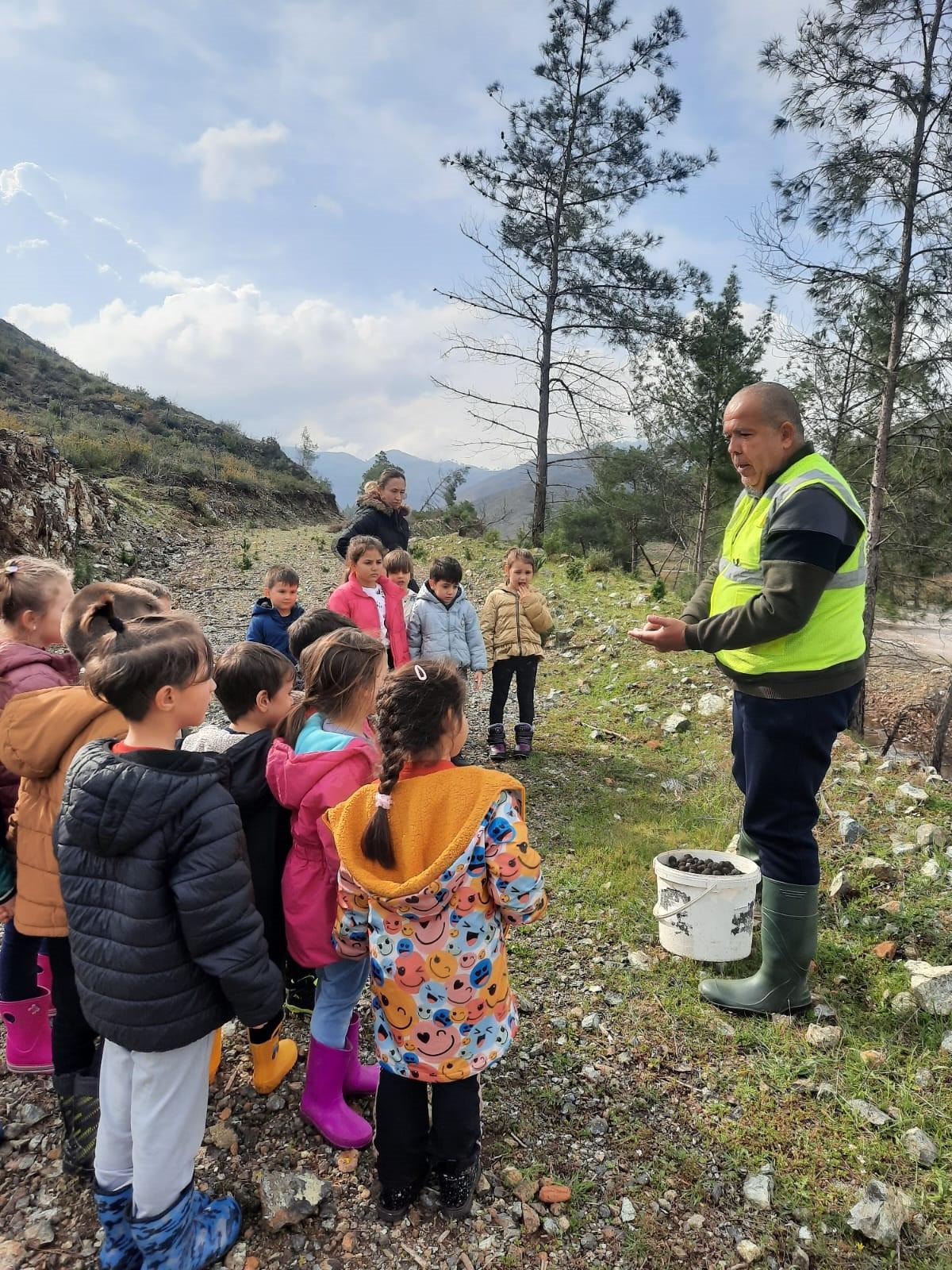 İçmeler Mahallesi Asparan mevkiinde 350 adet keçiboynuzu fidanı dikildi, anaokulu öğrencileri tarafından tohum topu atım etkinliği düzenledi.