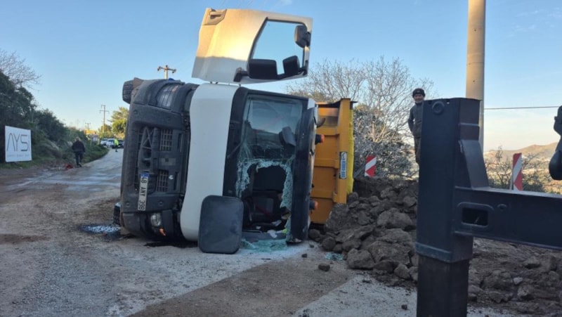Muğla'nın Bodrum ilçesinde Bağla'dan Gürece istikametine giden İ.E. idaresindeki hafriyat kamyonu yol kenarındaki çukura girerek devrildi.