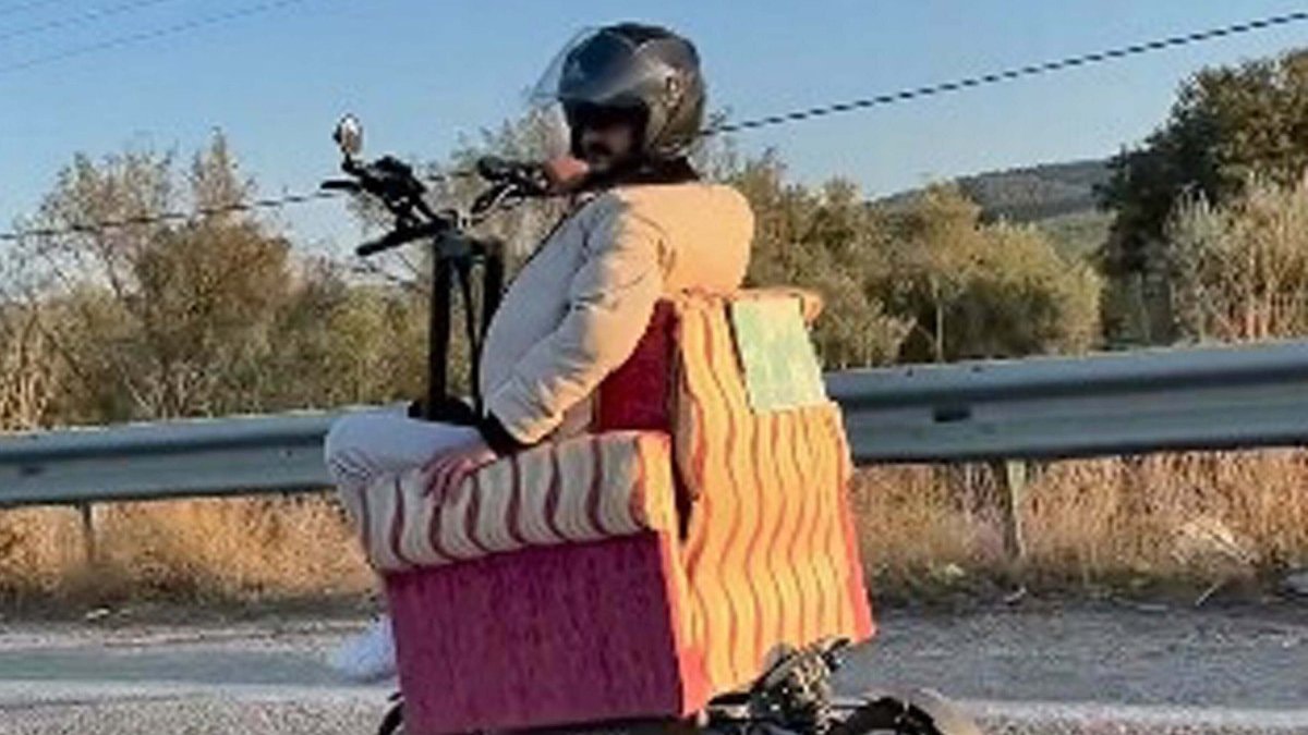 Bir süre sonra ayakta yolculuk yapmaktan yorulan Bostan, skuter üzerine bir ev koltuğu monte etti.