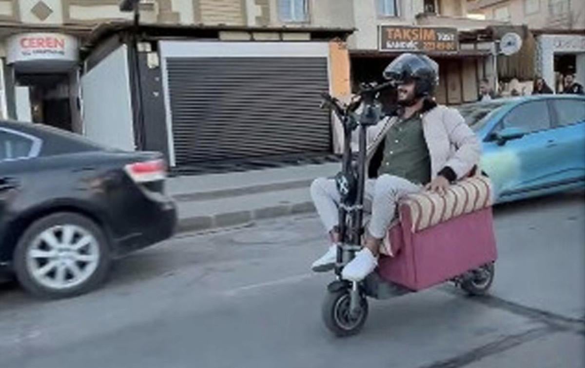 Bostan, ev koltuklu skuter yolculuğunu esprili bir yaklaşımla çektiği videoyu 'Ehliyeti kaptırınca ben' ifadesiyle sosyal medya hesabından paylaştı.