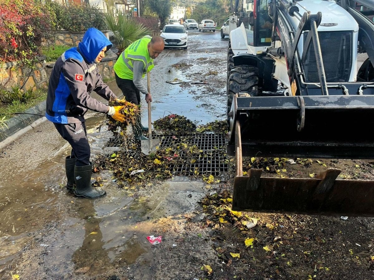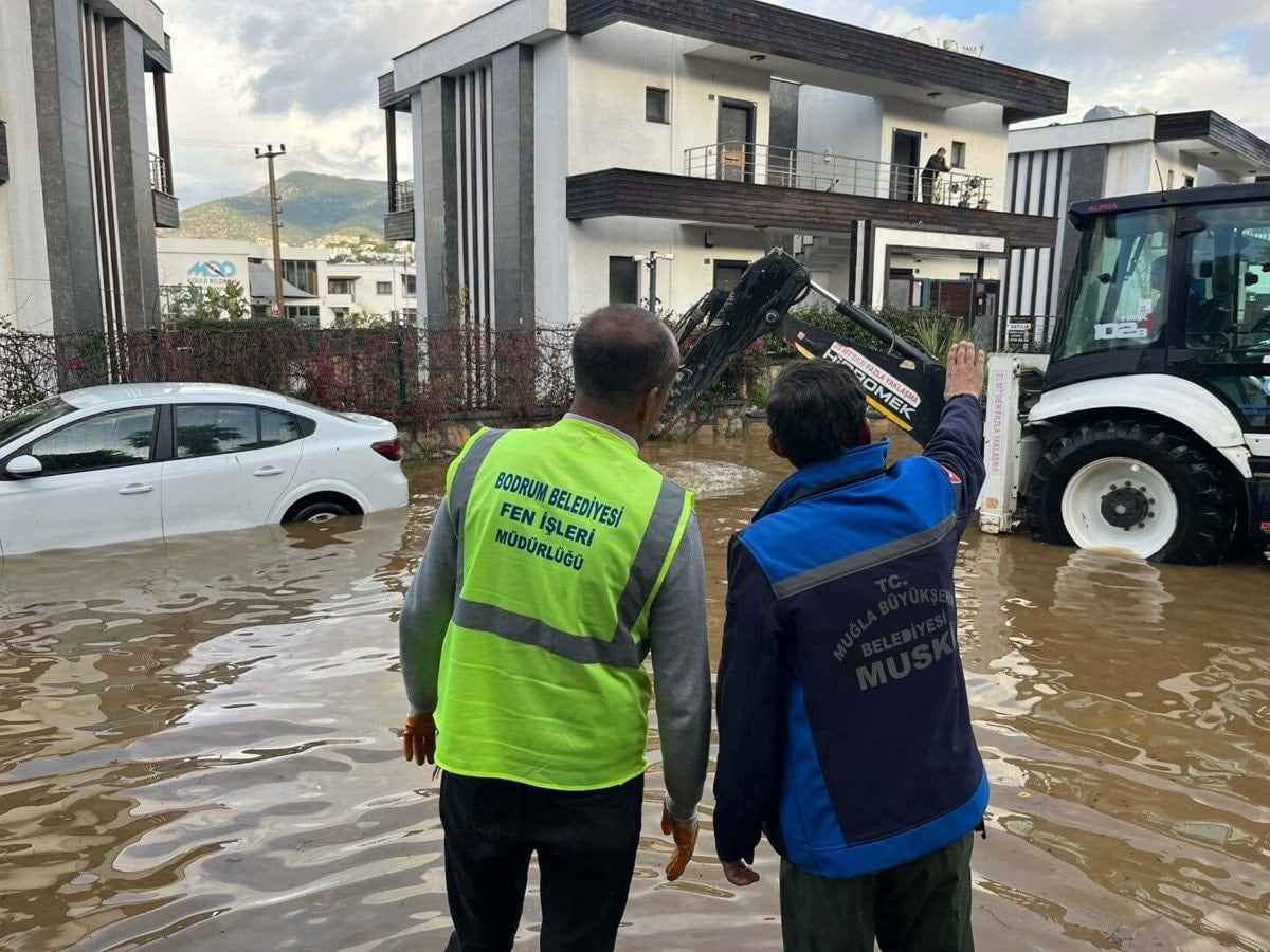 Bodrum Belediyesi afet ekipleri ve bölge sakinlerinin çalışmalarıyla yollardaki su birikintileri tahliye edilirken, trafik akışı normale döndü.