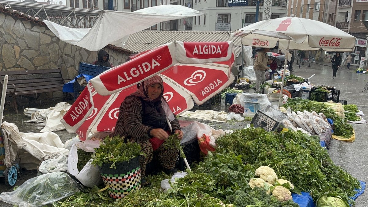 Pazarcı esnafı yağmur altında satış yapmaya çalışırken, özellikle yaşlı kadın esnafların zorlu hava şartlarına rağmen tezgâhlarını terk etmediği görüldü.
