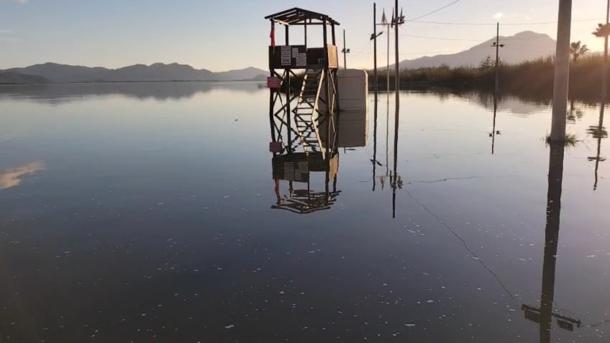 Muğla’nın Köyceğiz ilçesinde birkaç gündür aralıksız devam eden yağışlar sonrası Nam Nam Çayı, Kargıcak ve Yuvarlak Çayı’nın debisi yükselince taşan sular Köyceğiz Gölü’nde su seviyesini artırırken, Atatürk Kordonu’nun batı kısmı ile Delta Plajı sular altında kaldı.