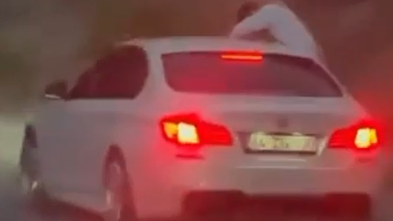 Bir aracın camından sarkarak tehlikeli şekilde yolculuk yapan bir kişi, içtiği sigarayı ise yola fırlattı.