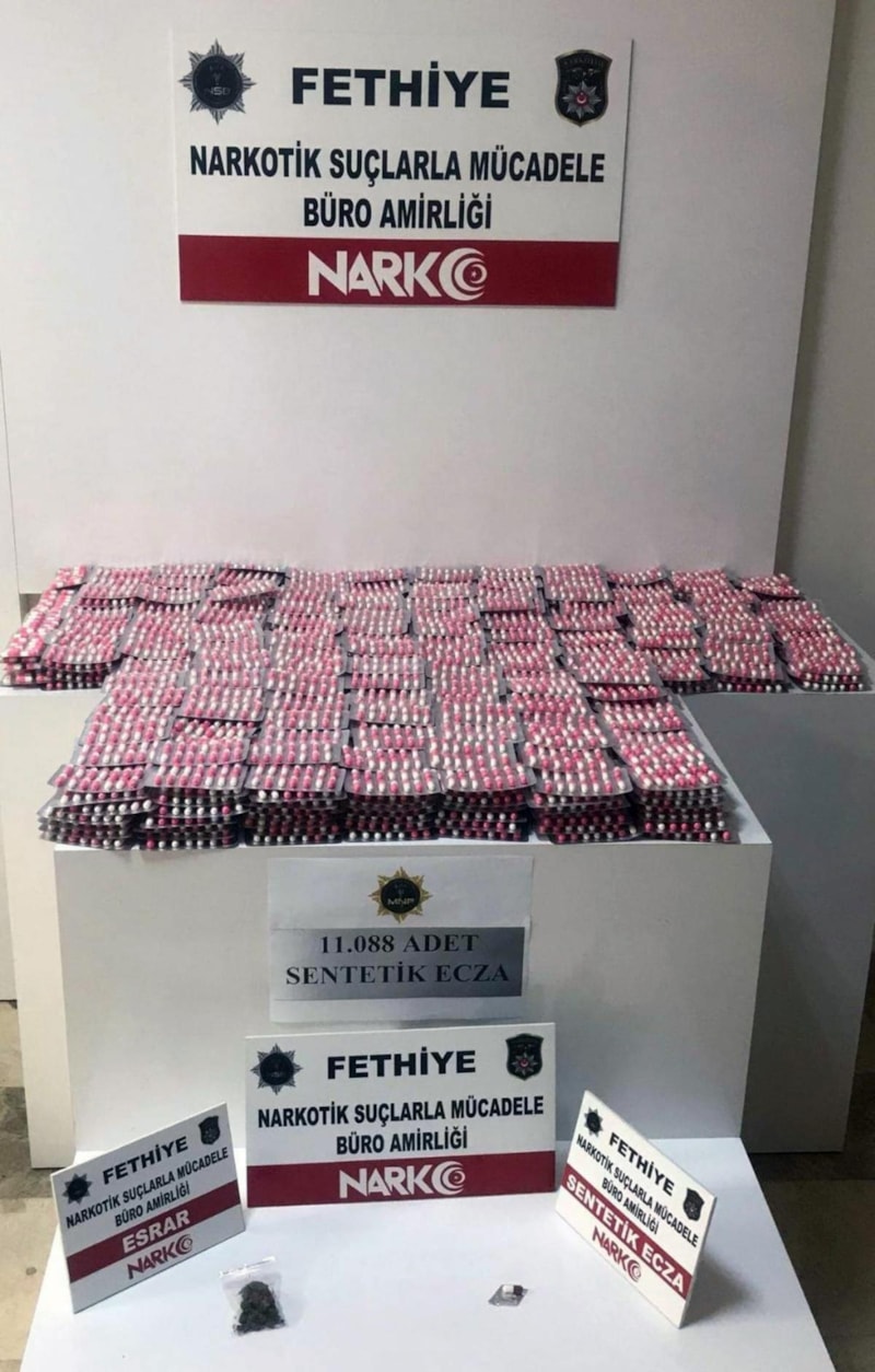 Yapılan aramada, 4 şüpheli şahıs, 11 bin 089 adet sentetik ecza ve 5,5 gram esrar ele geçirildi.