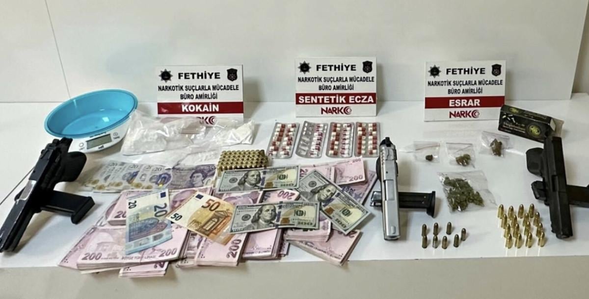 Üç ayrı adrese eş zamanlı düzenlenen operasyonlarda 1256 gram esrar, 101 gram kokain, 49 sentetik hap, 12 kök Hint keneviri, ruhsatsız 3 tabanca, 74 mermi ile birlikte uyuşturucu satışından elde edildiği değerlendirilen 132 bin 800 TL, 700 dolar, 220 pound ve 70 euro ele geçirildi.