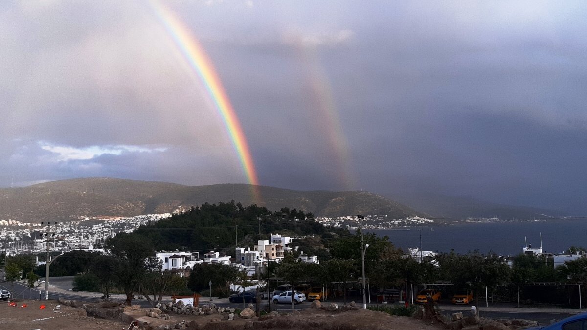 Muğla'nın Bodrum ilçesinde aralıklarla yağan yağmur sonrasından çıkan gökkuşağı Bodrum’u aydınlattı.