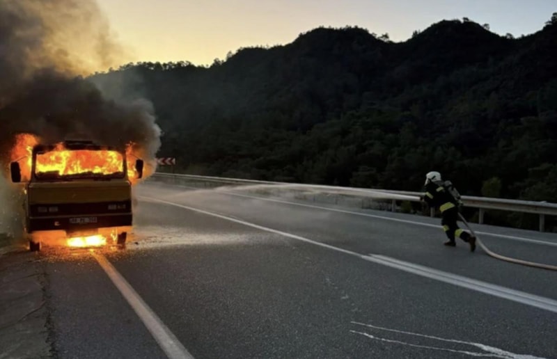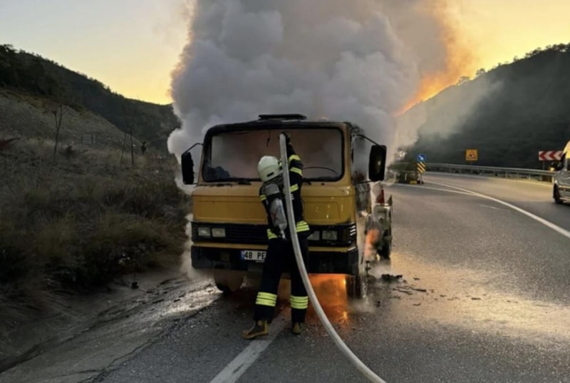 Fethiye ilçesi Göcek Mahallesi'nde tankerinde akaryakıt dolu olan kamyonet, motor kısmında başlayan yangın sonrası ateş topuna döndü.
