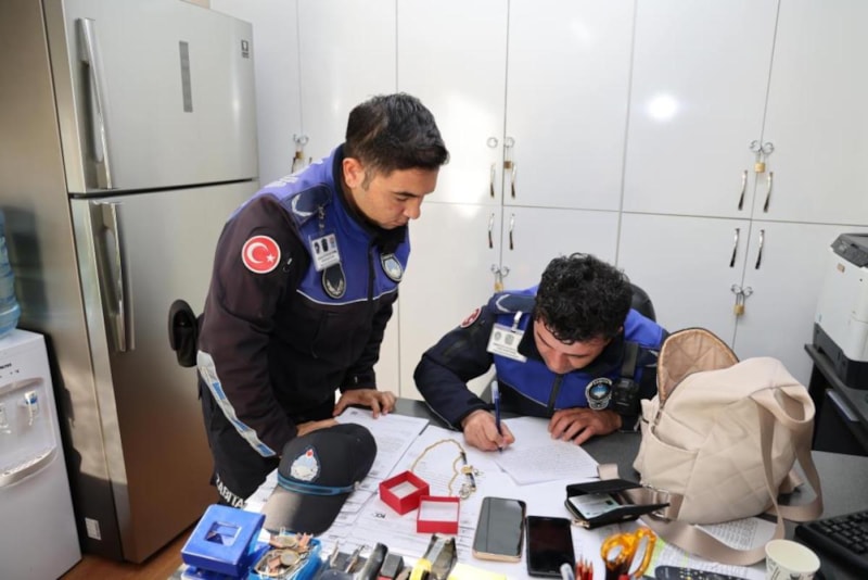 5 yüzük, 2 küpe, 1 kolyenin bulunduğu çantayla ilgili tutanak tutulduğu sırada çanta içindeki telefonu arayan çanta sahibi zabıta merkezine çağırılarak eşyaları teslim edildi.