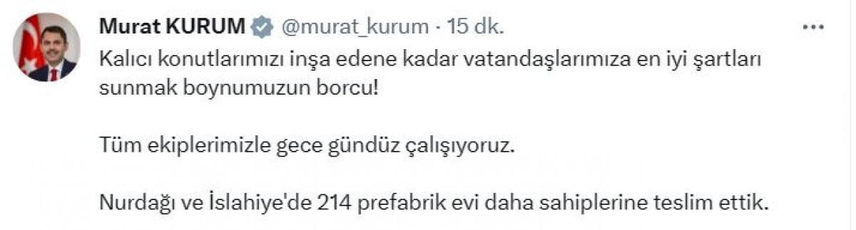 Çevre Şehircilik ve İklim Değişikliği Bakanı Murat Kurum, Twitter'daki hesabından yaptığı açıklamada, "Kalıcı konutlarımızı inşa edene kadar vatandaşlarımıza en iyi şartları sunmak boynumuzun borcu. Tüm ekiplerimizle gece gündüz çalışıyoruz. Nurdağı ve İslahiye’de 214 prefabrik evi daha sahiplerine teslim ettik." ifadelerini kullandı.