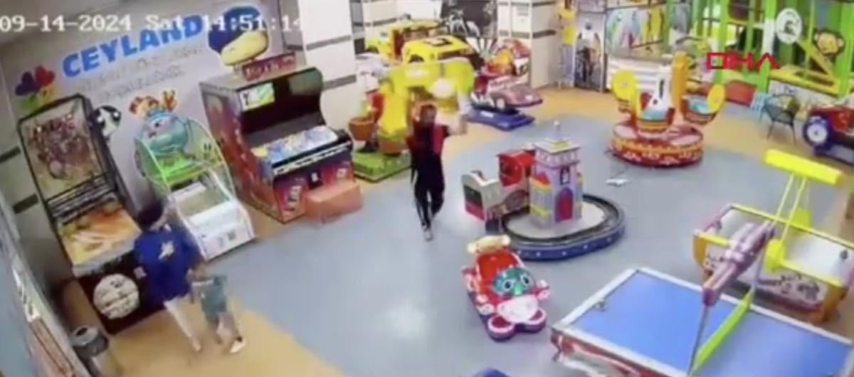 Oyun alanının kapısının camını da kıran saldırgan, diğer iş yerlerine de saldırdı.